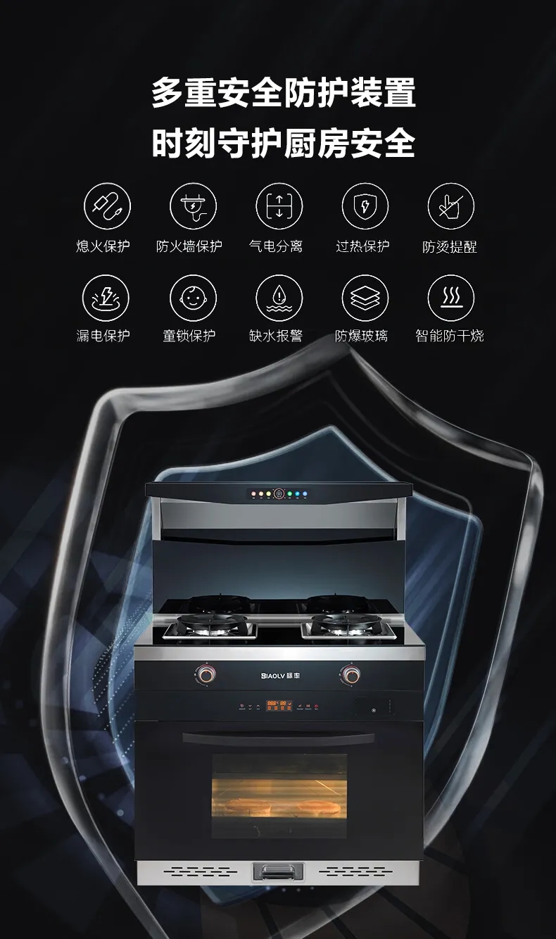 标率集成灶产品还专门配置了定时功能、防空烧报警、防火墙、熄火保护等多重安全防护,保障了使用安全。